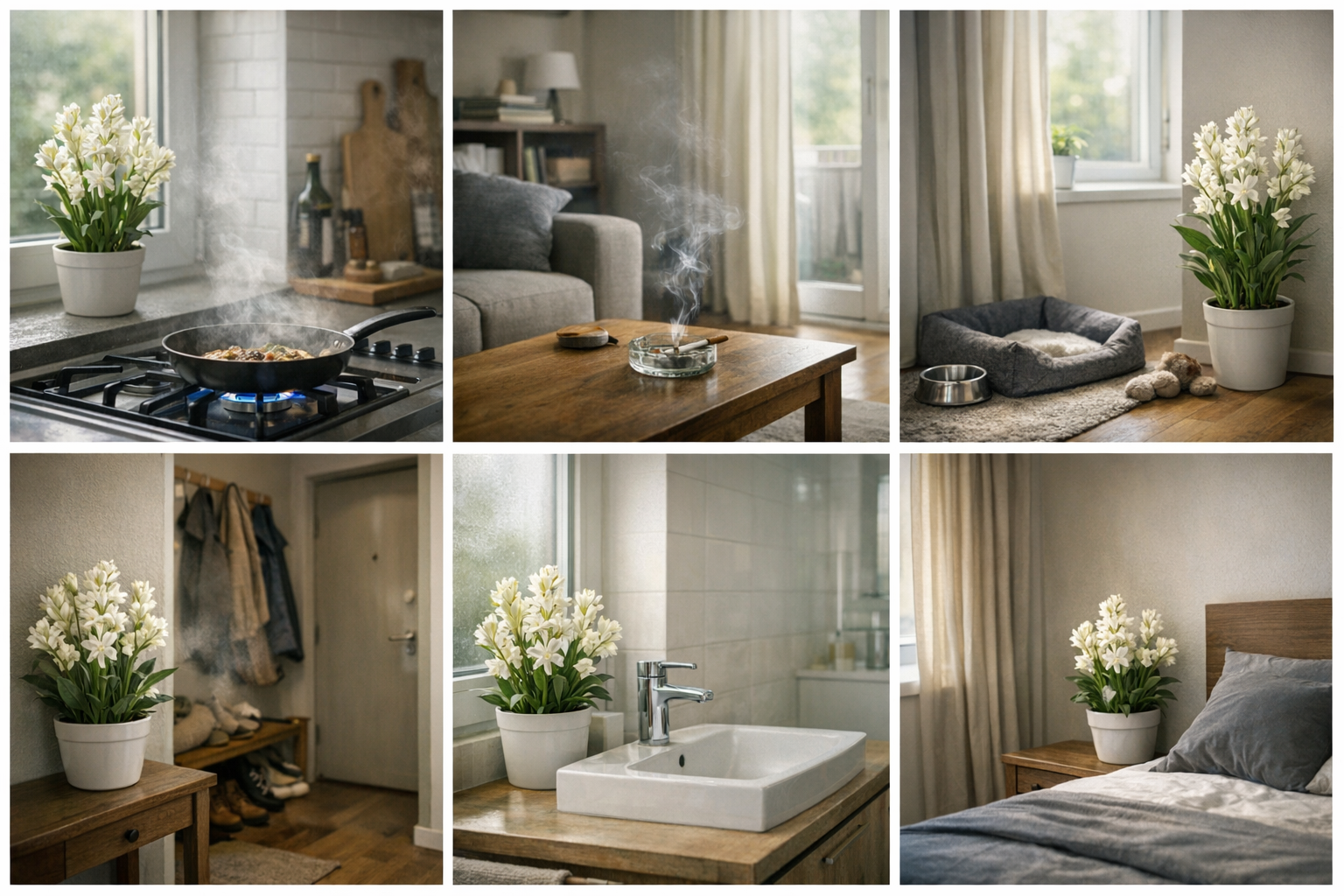 Тубероза не просто додає приємний аромат — вона перекриває і приглушує неприємні побутові запахи, які накопичуються в квартирі. Завдяки насиченому, але м’якому природному запаху, повітря сприймається чистішим і свіжішим, без різких нот і хімії.