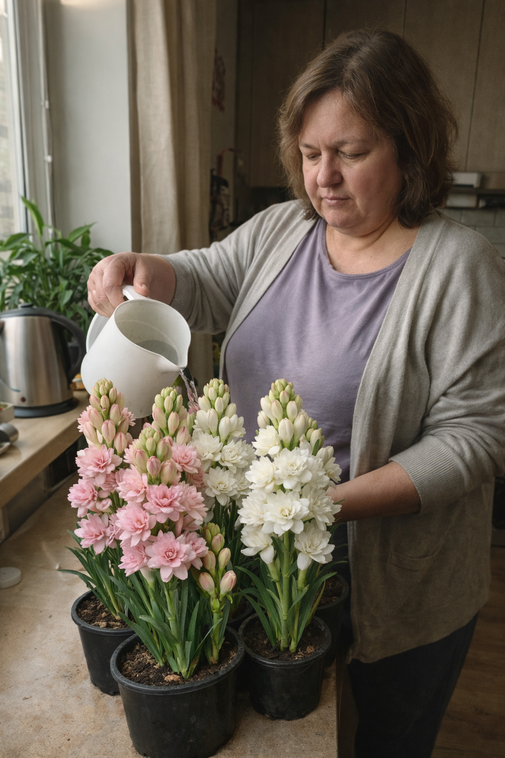 Після посадки важливо не заливати водою — тубероза цього не любить. Поливати потрібно тоді, коли верхній шар ґрунту підсох. Температура — звичайна кімнатна, без протягів. За таких умов рослина швидко приживається і починає активно рости, а цвітіння з’являється вже через кілька тижнів.