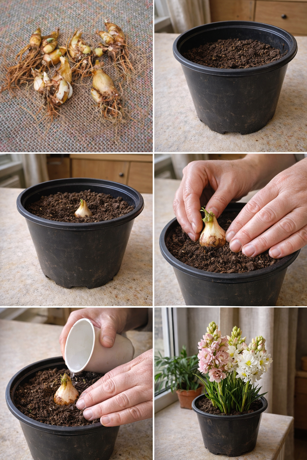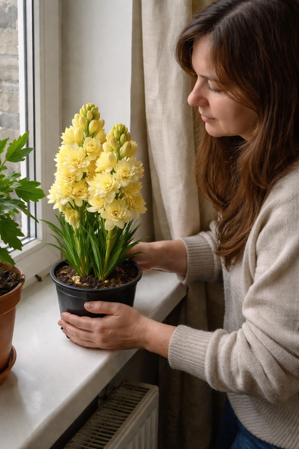 Для посадки туберози підійде звичайний горщик з отворами і легкий поживний ґрунт. Цибулину садять так, щоб верхня частина залишалась над поверхнею ґрунту — не закопувати повністю. Після посадки ґрунт злегка ущільнюють і поливають помірно, без переливу. Горщик ставлять у світле місце, бажано на підвіконня.