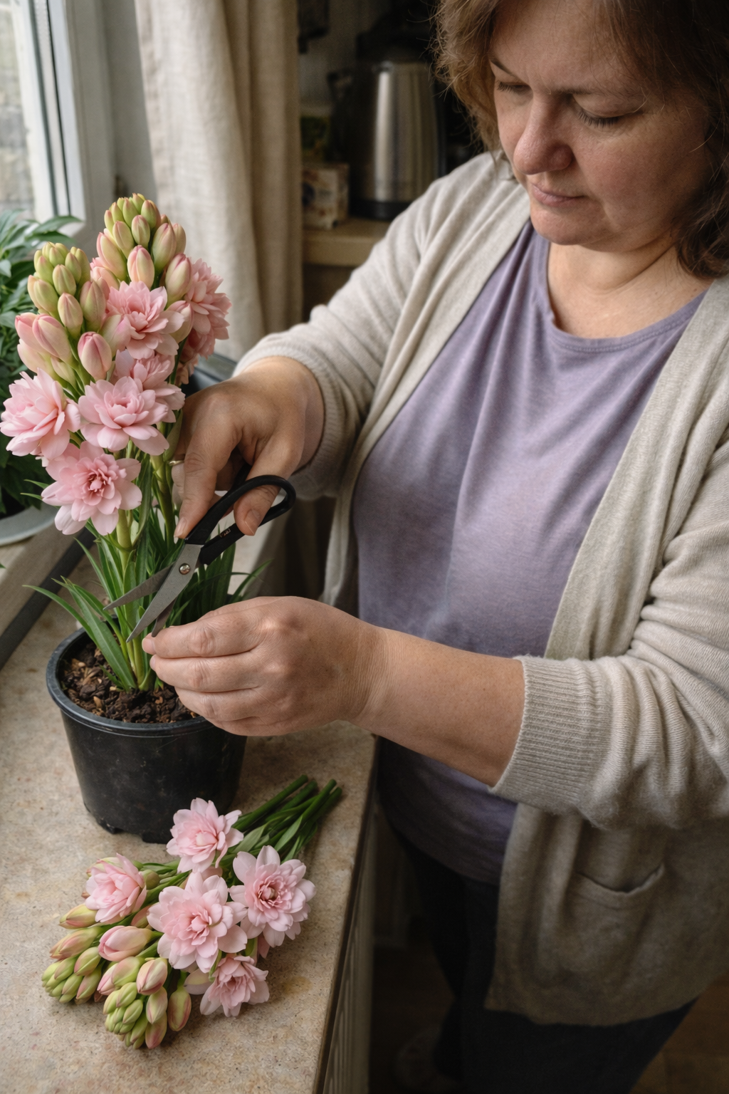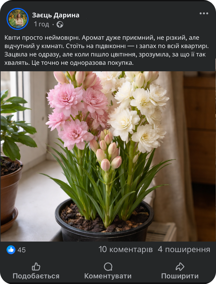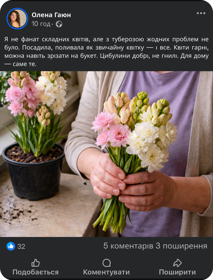 Рослина проста у вирощуванні: любить світле місце, помірний полив і звичайний ґрунт. Після кімнатного вирощування туберозу можна пересадити у відкритий ґрунт, де вона продовжить рости як садова рослина. Це робить її не одноразовою покупкою, а повноцінною квіткою “на роки”.